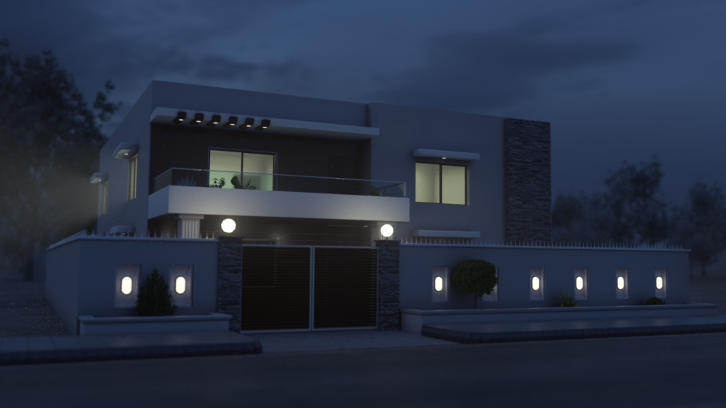 - Night: Focuses on the architectural lighting scheme, where the sphere lights on the pillars and the recessed wall sconces transform the facade into a high-end, secure estate.